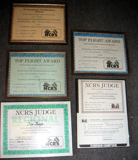 National Corvette Restorers Society Awards Thorpe's Body & Corvette Shop has achieved excellence in full restoration and have the awards to prove it. As one of the premiere experts in Corvette restoration and a Member of the National Corvette Restorers Society, Tim Thorpe has receive the Top Flight award for excellence in restoration along with recognition and praise for his performance as a judge.